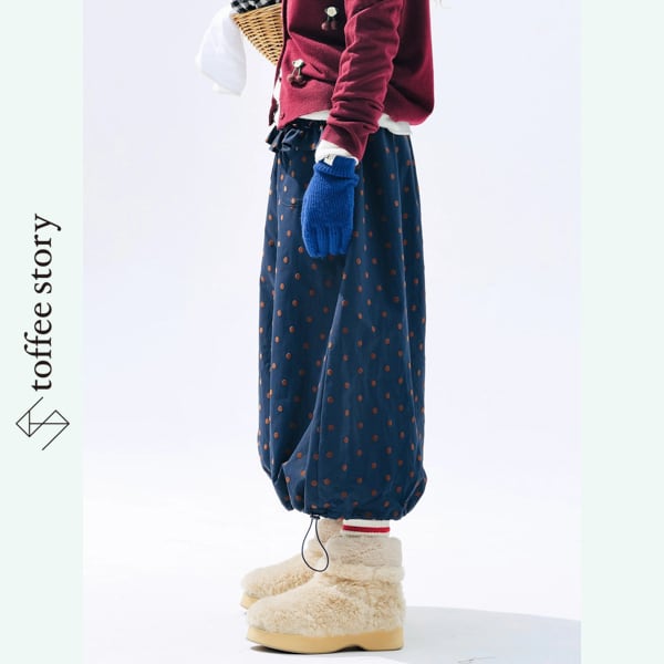 可愛らしいフリルを添えたフロントの2つのポケットが、シンプルなドット柄にアートな立体感をプラス。