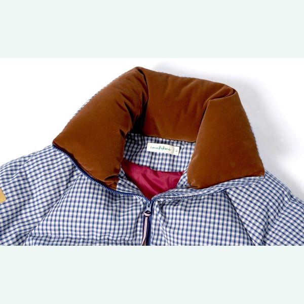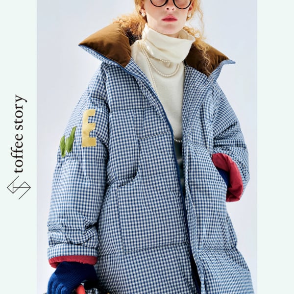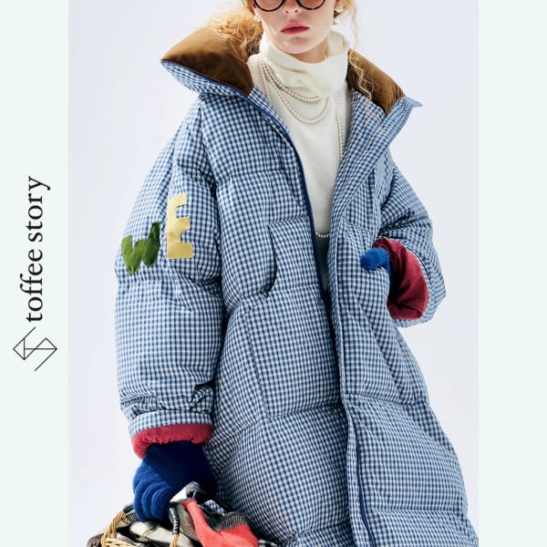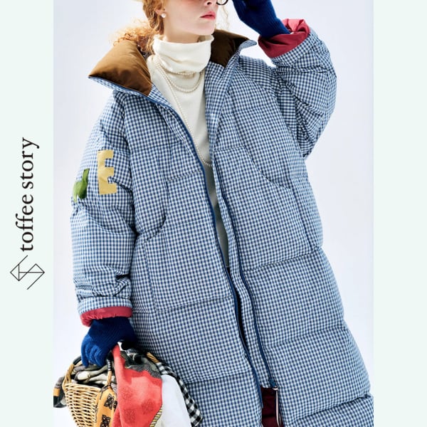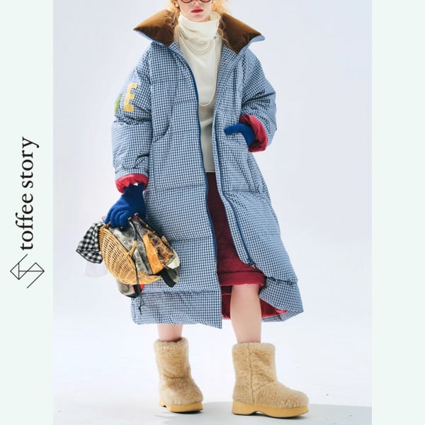 imakokoniらしい“元気なひねり”が効いた、ブルーのギンガムチェックが目を引くロングダウンジャケット。