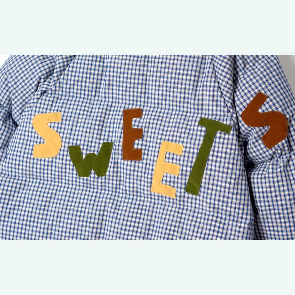 厚手であたたかく、アースカラーの「SWEETS」アップリケがまるでアート作品のように存在感を放ちます。