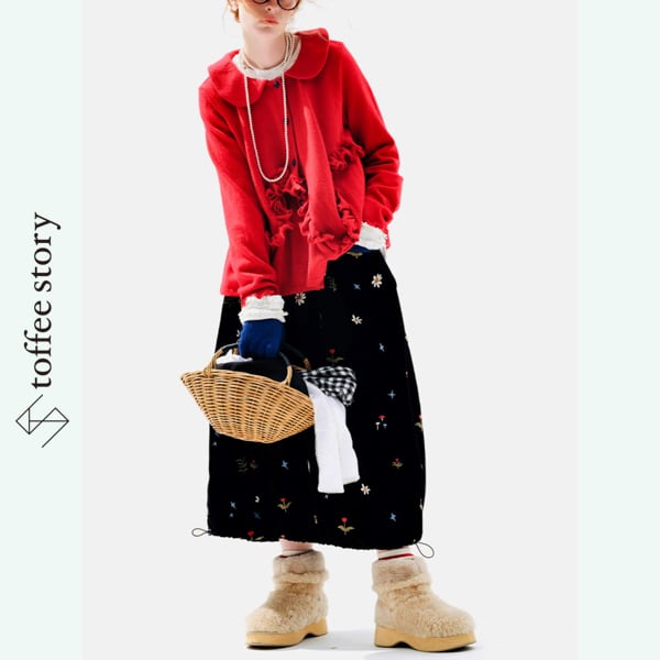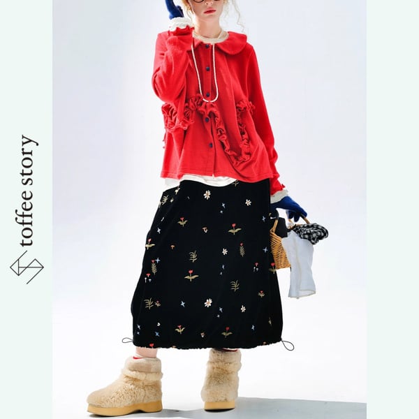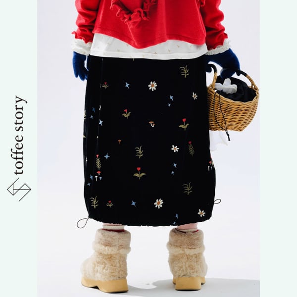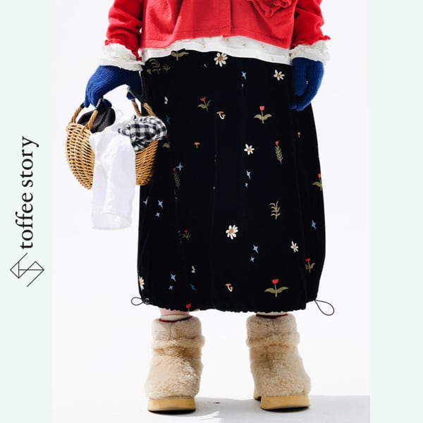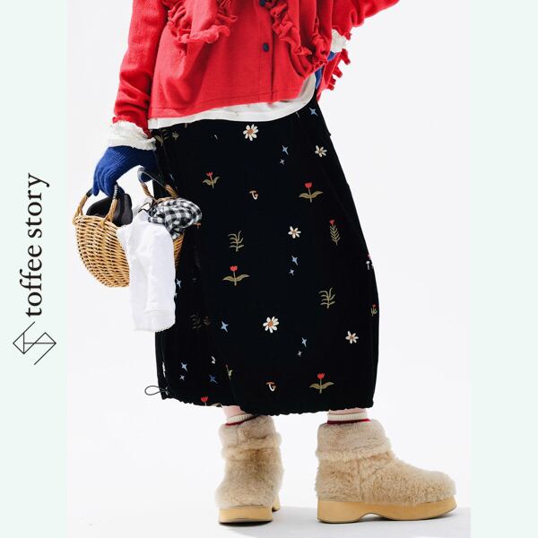ブラックベースにカラフルな小花柄が散りばめられた、imakokoniらしい遊び心あふれるロングスカート。