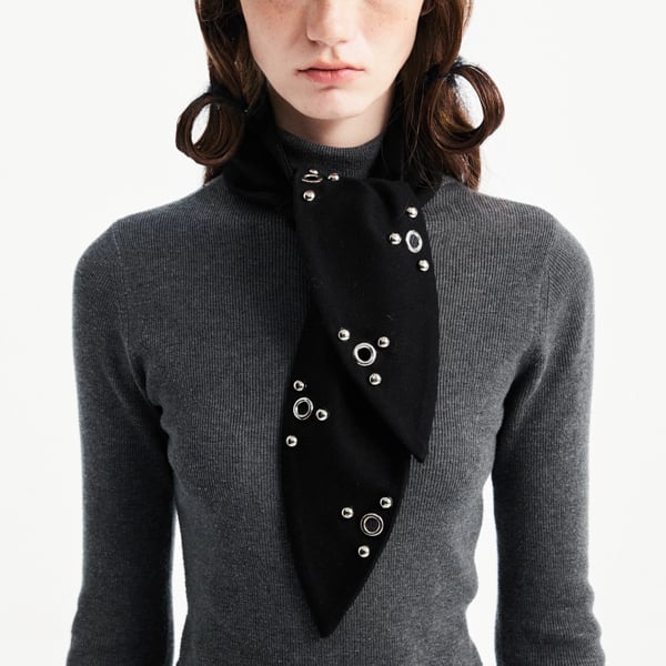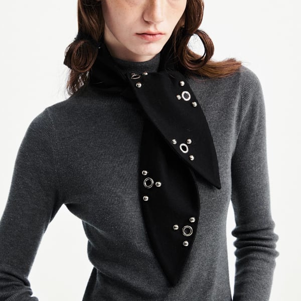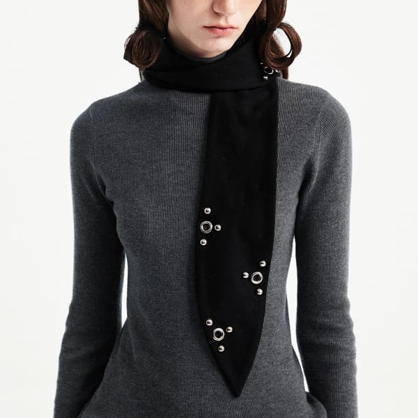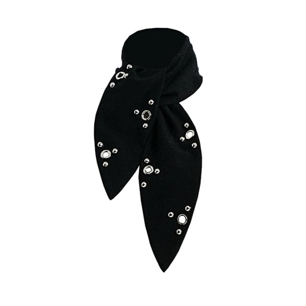 深いブラックに、アイレットとリベットが静かに光を散らすスカーフ。