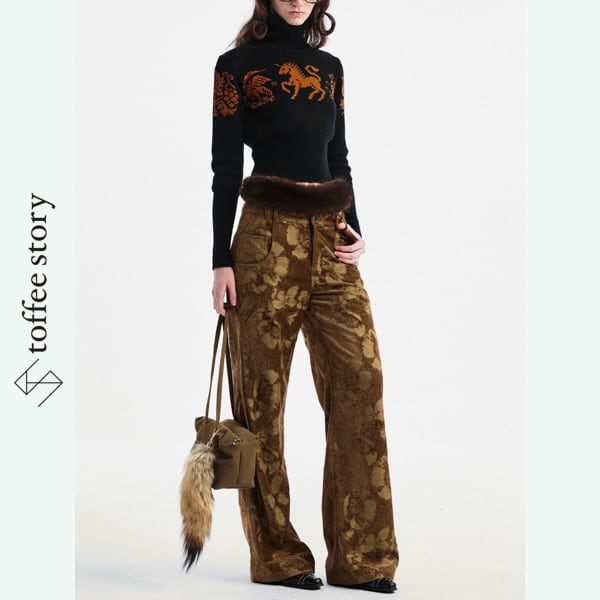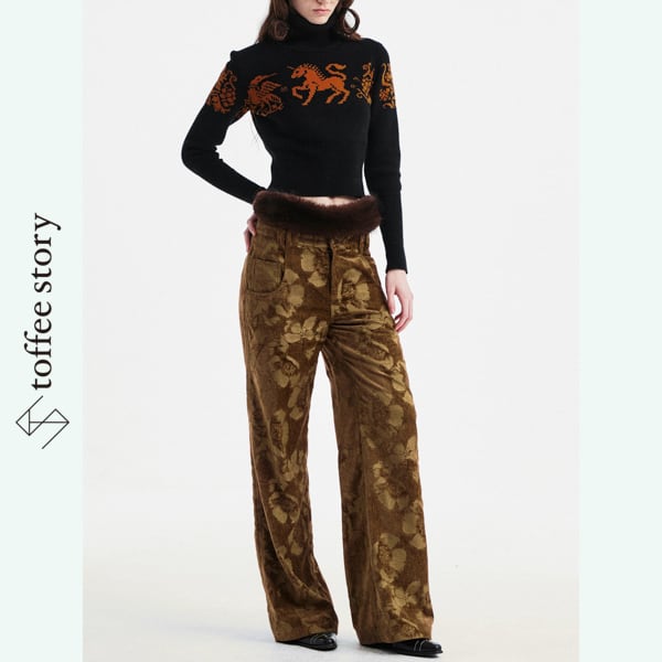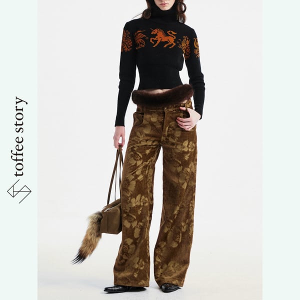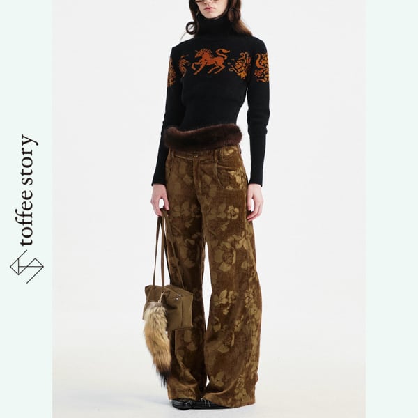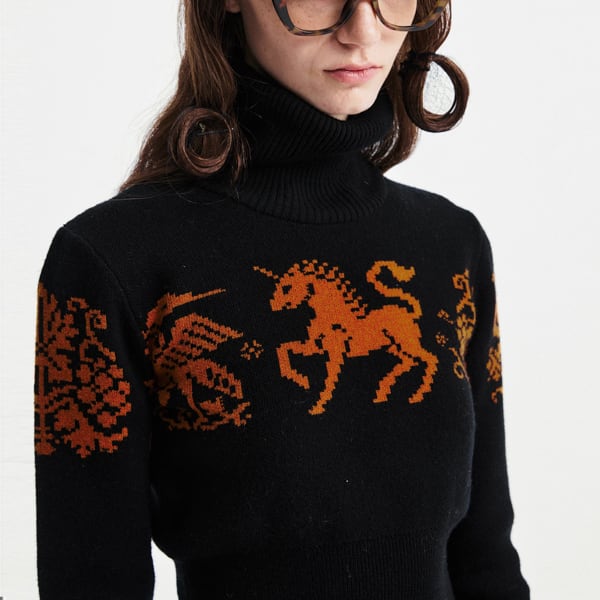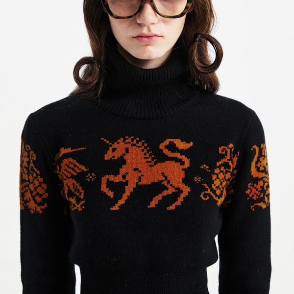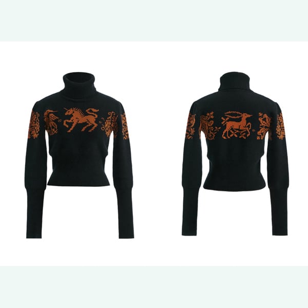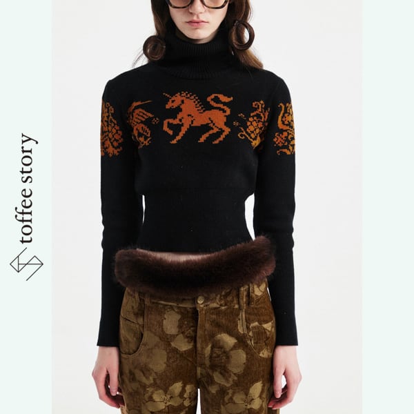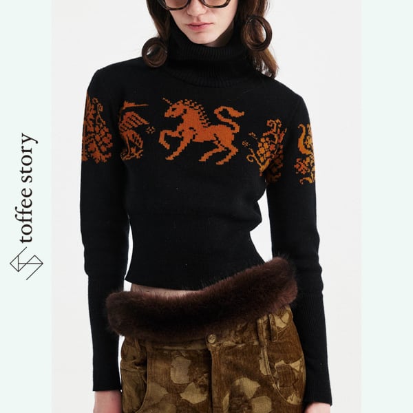 深い黒のニットに、朱のペガサスがひと筆の衝動のように浮かび上がるタートルネック。