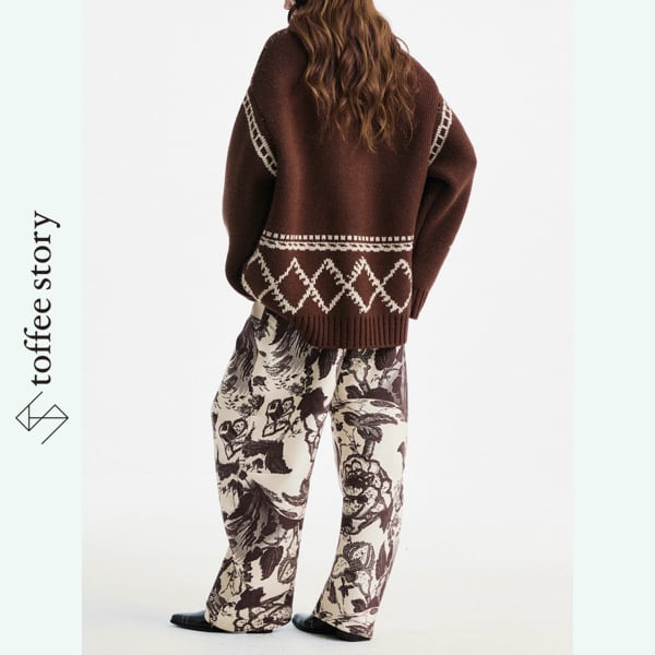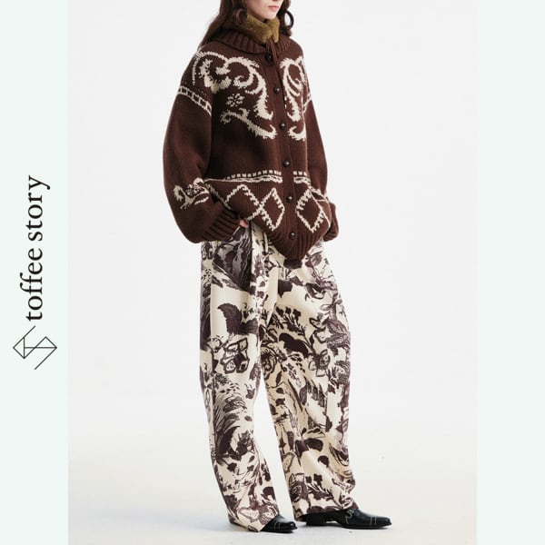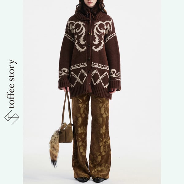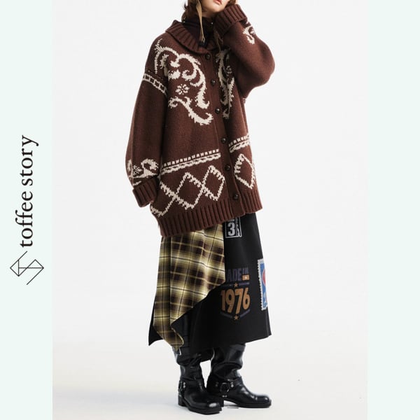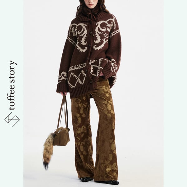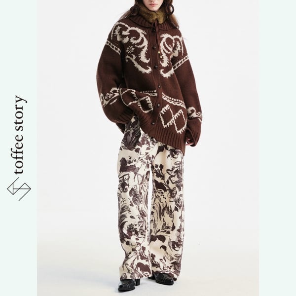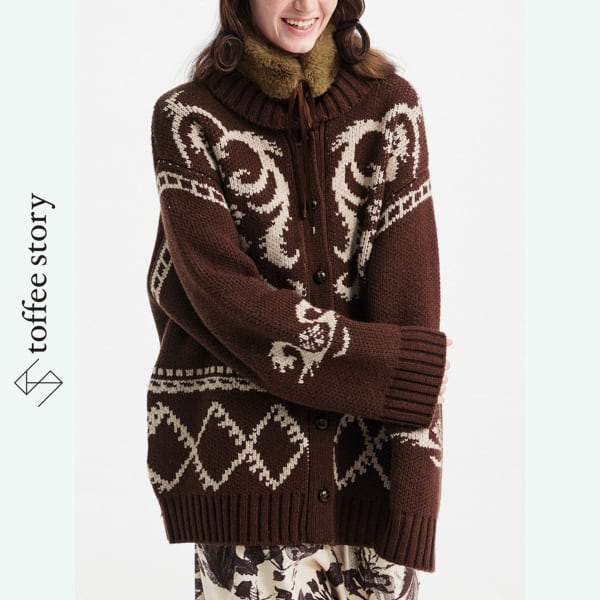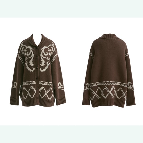 落ち着いたブラウンに、ジャカードの揺らぎがそっと沈むカーディガン。