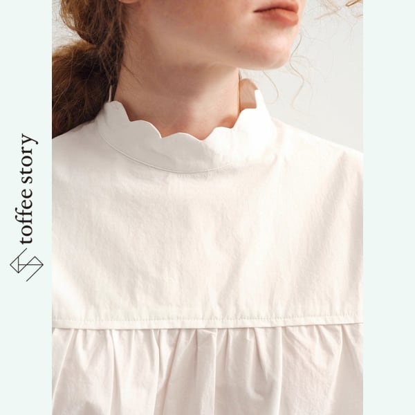 胸元のギャザーと裾のフレアが生む陰影は、重ね着にも奥行きを与え、
