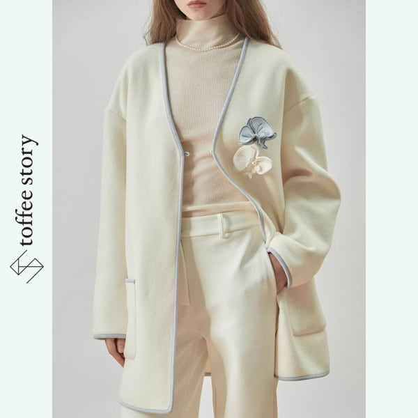水色と白の花びらコサージュには、淡い輝きを宿すホワイトパールが添えられ、胸元にそっと物語の始まりを灯します。軽やかなライトブルーのエッジが、冬の光をすくうように輪郭をふわりと縁取り、XUNRUOらしいロマンティックな空気を漂わせます。左右の大きめポケットは、手を入れたときの安心感さえ詩的なワンシーンに。