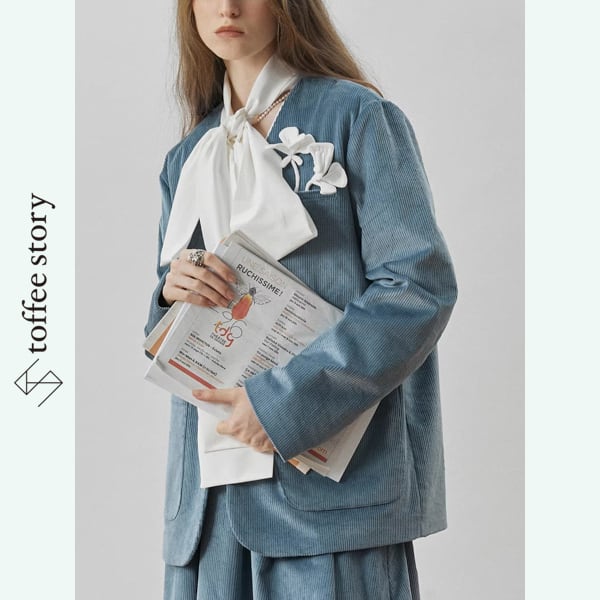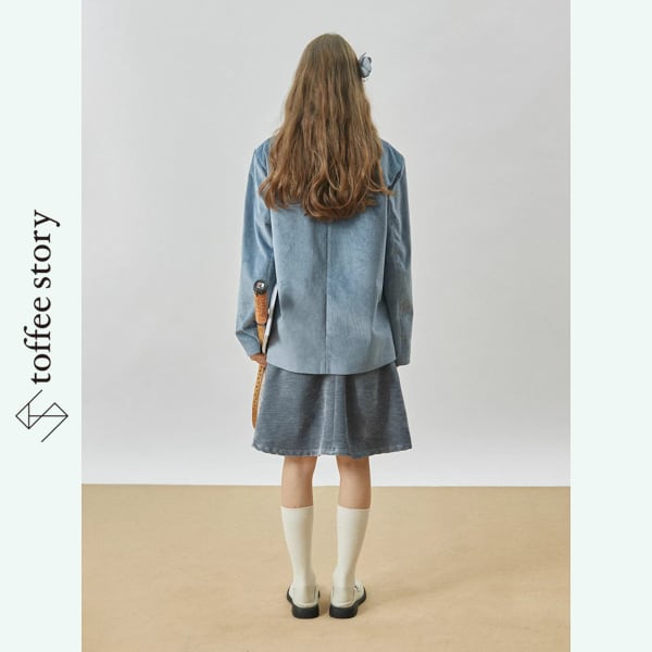 ブルーのコーデュロイが冬の空気を優しく映すカジュアルスーツジャケット。