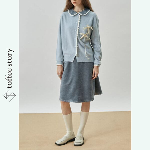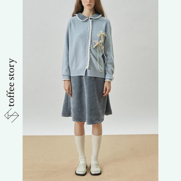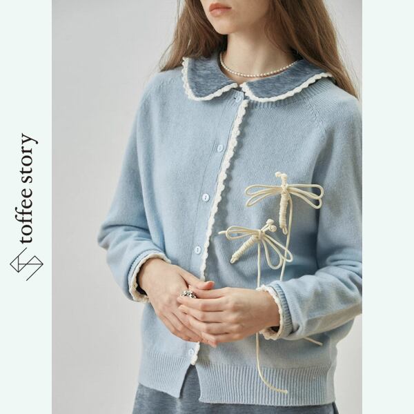 ライトブルーのやわらかな色合いに、合わせ部分へ繊細なレースがそっと寄り添うカーディガン。