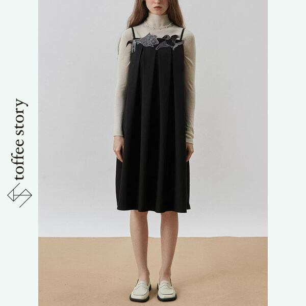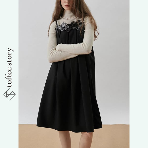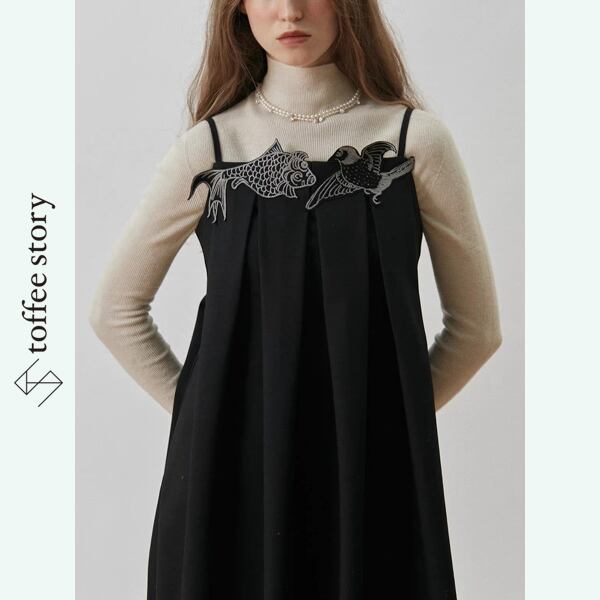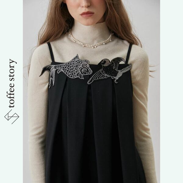 シックなブラックに、胸元へそっと添えられた“鳥と魚”のモチーフ刺繍が印象を残すキャミワンピース。