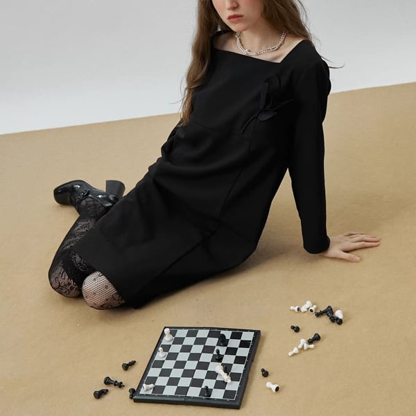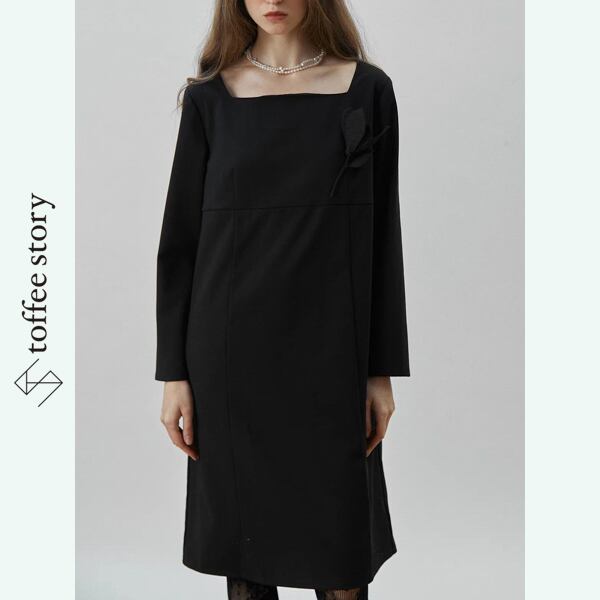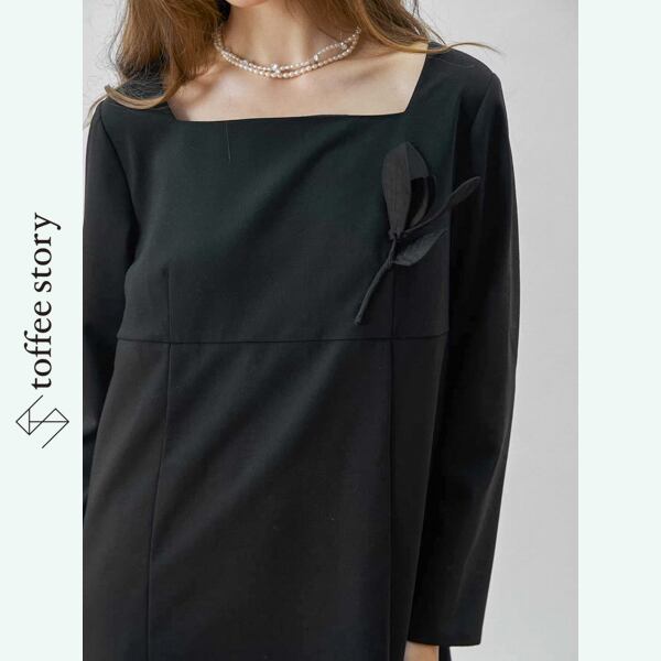 深いブラックの中に、同色で仕立てた立体フラワーが左胸へそっと浮かび上がる膝丈ワンピース。
