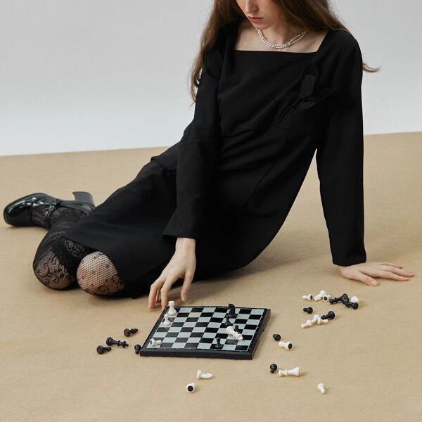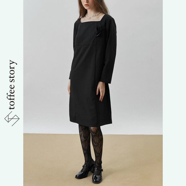 スクエアネックがデコルテをすっきりと見せ、ストレートスカートのラインがシックでモードな佇まいをつくります。