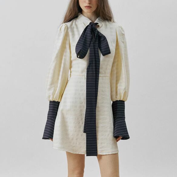 淡いイエローの生地に、裾までまっすぐ伸びる大きなボウタイが印象を刻む膝上丈のシャツワンピース。