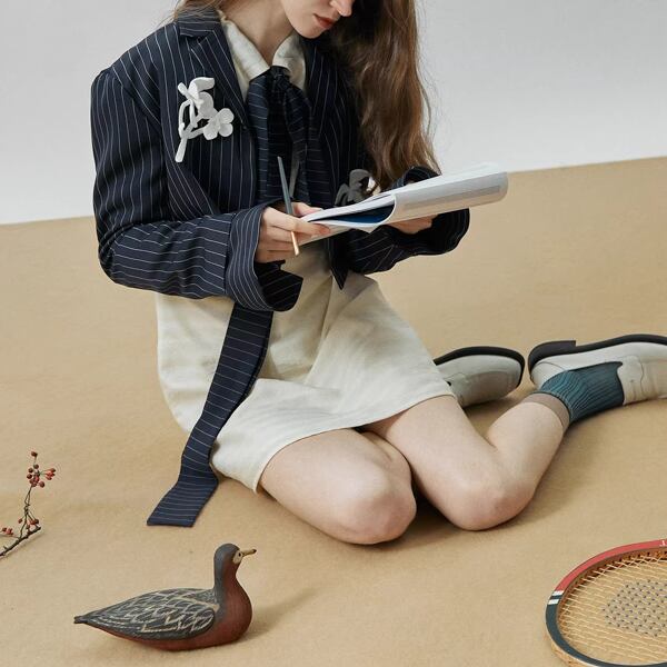 裾口はボウタイと同じ配色でベルのようにふわりと広がり、動きに合わせてアートのリズムを描きます。