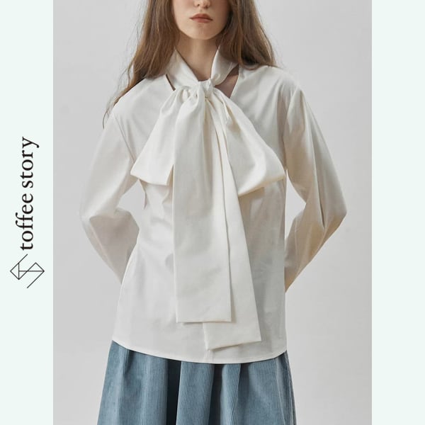 シンプルなホワイトカラーだからこそ、表情の強いボウタイが美しく引き立ち、日常にも特別な日にも寄り添う一枚です。