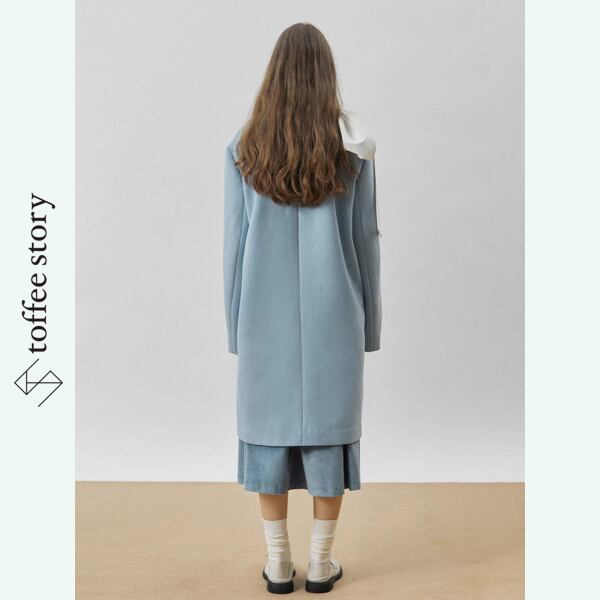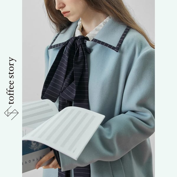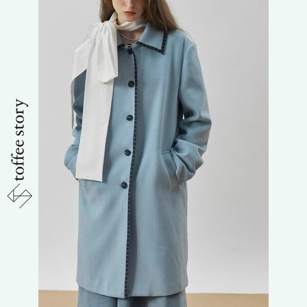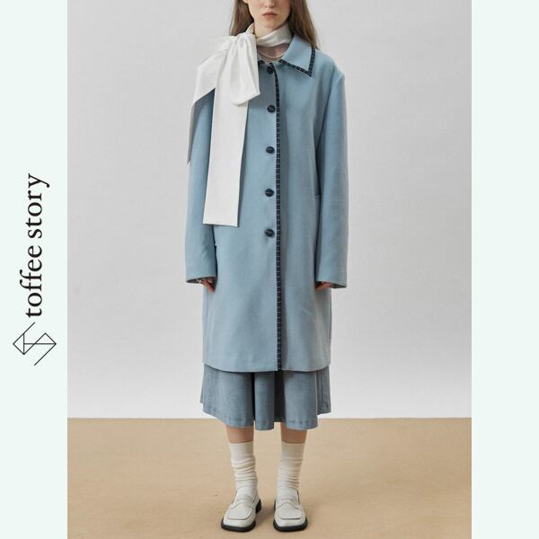 ライトブルーをベースに、襟のエッジと合わせ部分へストライプを効かせたロングコート。
