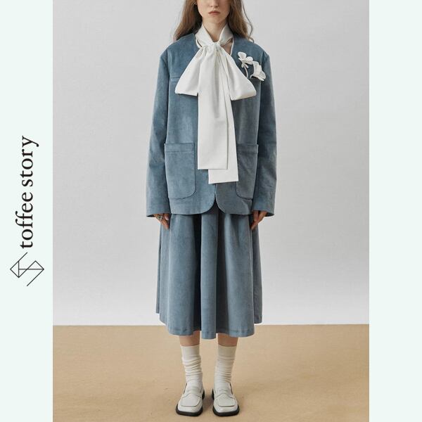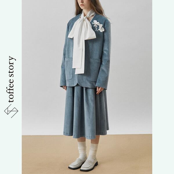 ブルーのコーデュロイ生地に、ふんわりとしたプリーツを重ねたミモレ丈スカート。