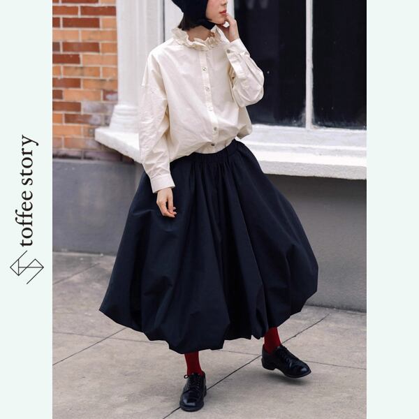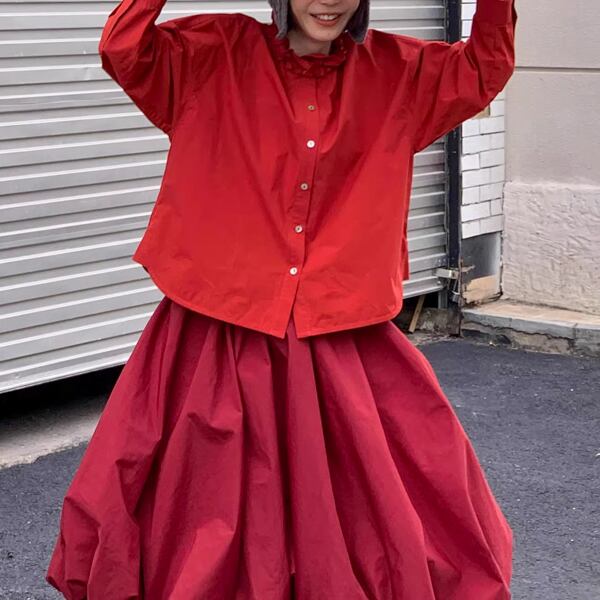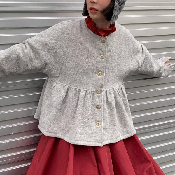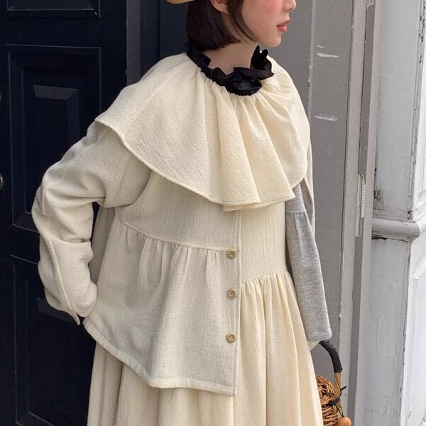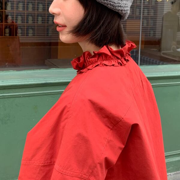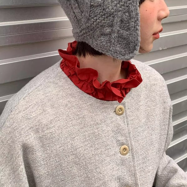 ルーズなシルエットは空気をたっぷり含み、重ね着の際にはフリルだけがそっと顔をのぞかせ、まるで映画の主人公がふと振り返る一瞬のような余韻を添えます