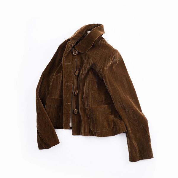 フロントには菊の花を思わせる大きなボタンが輝き、装いに静かなドラマを添えるアクセントに