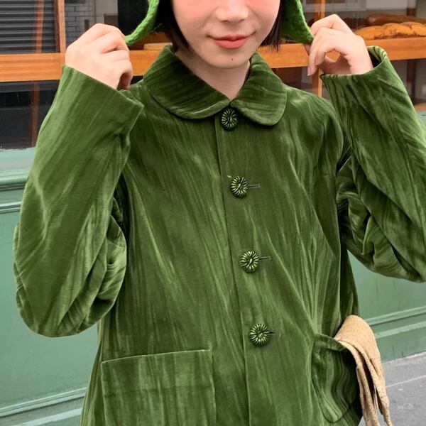グリーンとブラウンの2色がそれぞれ異なる物語を描き、丸みを帯びた襟がどこかクラシカルな余韻を漂わせます