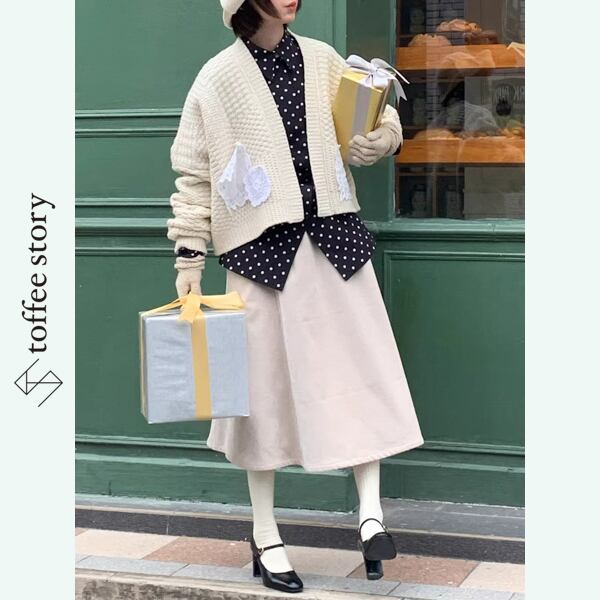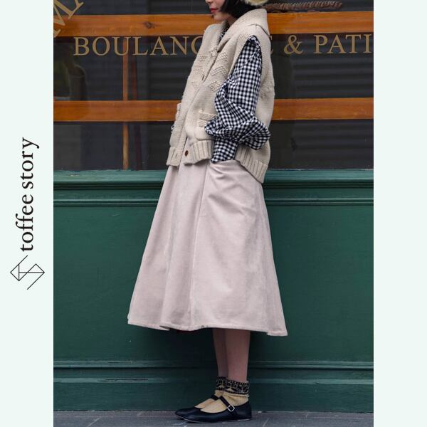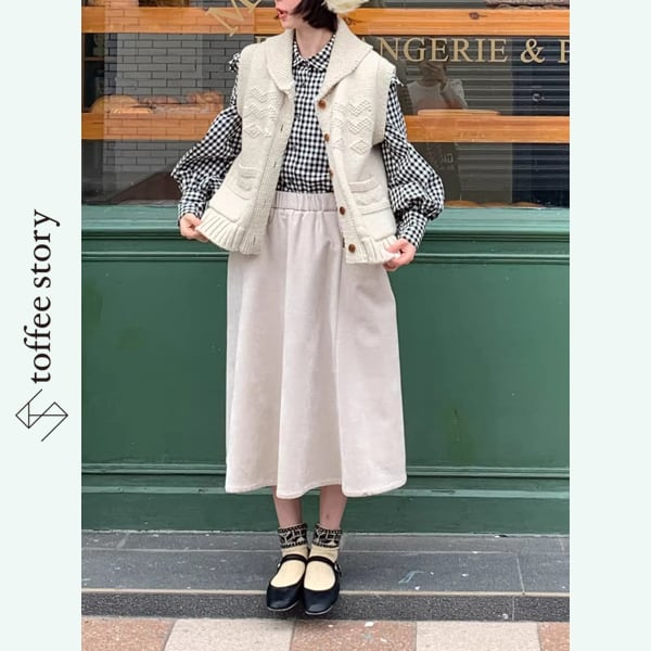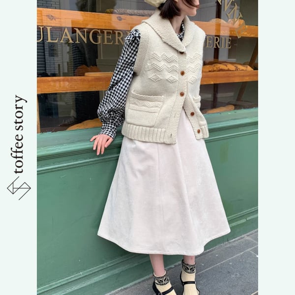 シンプルなブラウスを合わせればレトロモダンな気品が立ち上がり、ざっくりニットと重ねれば優しい空気に包まれるような装いに
