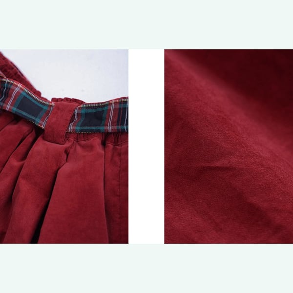 片面は深みのあるレッド無地のコーデュロイで、冬の午後の陽だまりのようなあたたかさを纏い、もう片面はレッド×グリーンのギンガムチェックが物語のページをめくるような華やぎを添えます