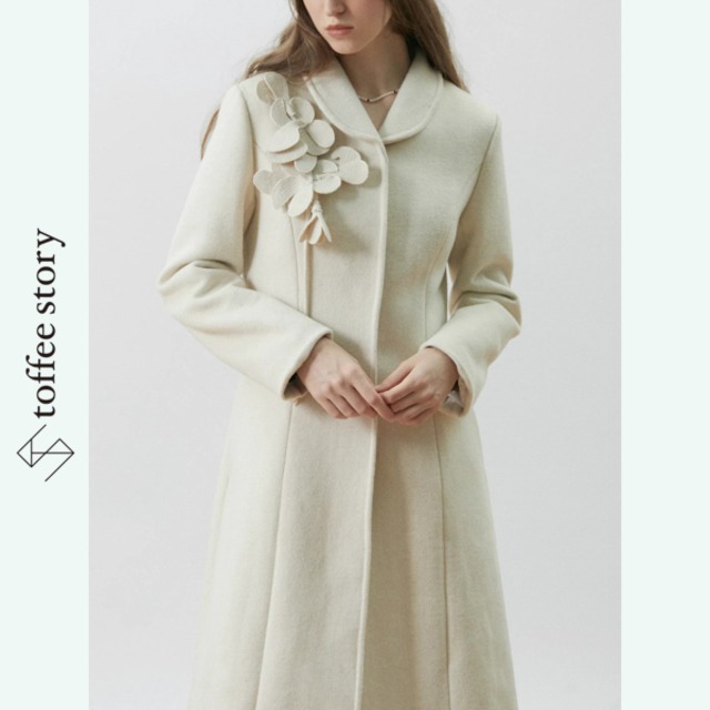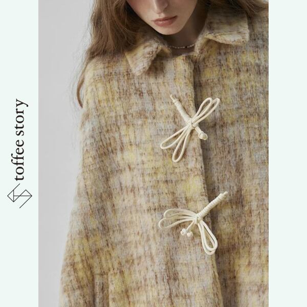 丸みを帯びた襟が優しい表情をつくり、合わせ部分にはトンボモチーフの立体装飾を添えて、ふわりと羽音を感じるようなアート性を生み出します。