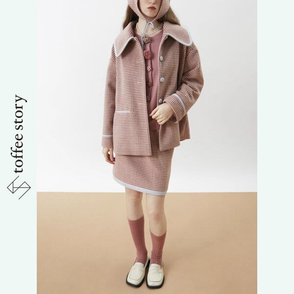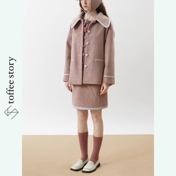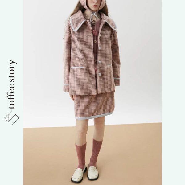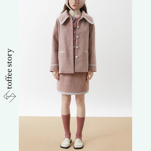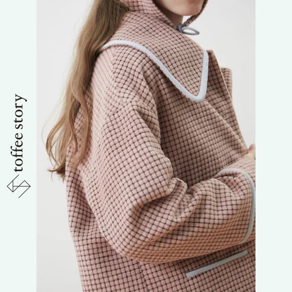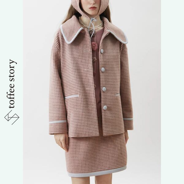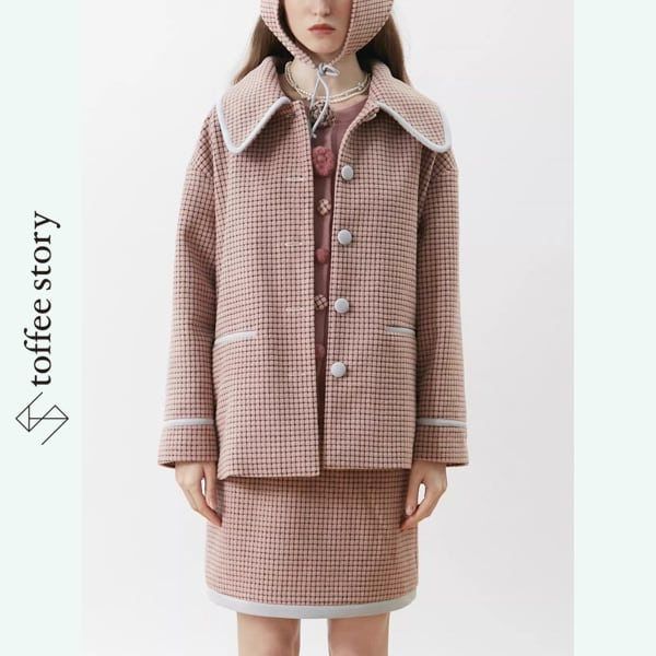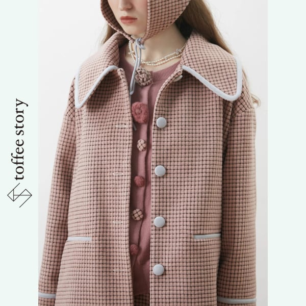 ピンクブラウンのチェック柄がやわらかく映えるシングルブレストのブレザーコート。