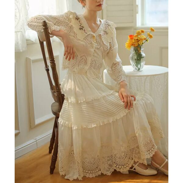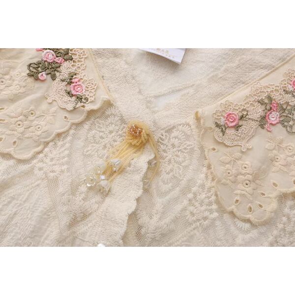 フェミニンなフラワー刺繍入り総レースブラウス。ドールカラーには繊細なレース素材に優しい花々が刺繍されており、上品で華やかな印象を与えます。透け感のあるデザインが、女性らしい色気を演出してくれる一枚です。