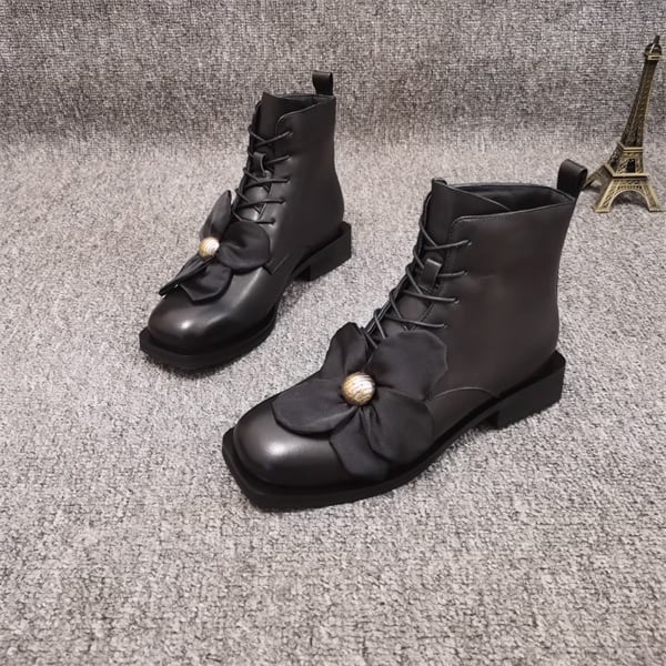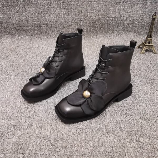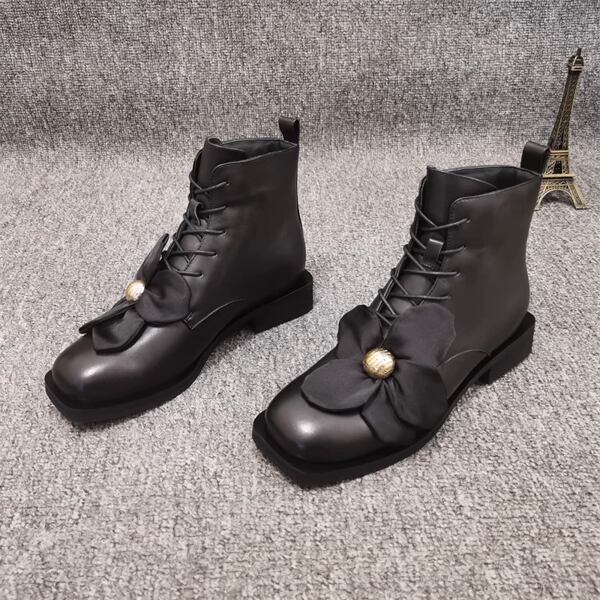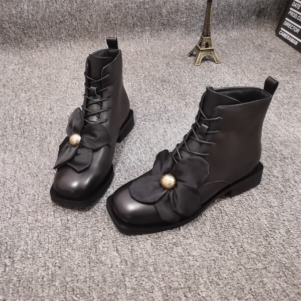 クラシックなレースアップデザインに、フラワーモチーフが美しく調和したブーツ。高級感のある素材と細部へのこだわりが、大人の女性にふさわしいエレガンスを提供します。スタイリッシュなデザインで、どんなシーンでも足元に輝きを。
