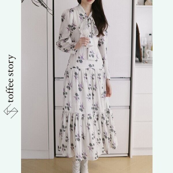 グリーンとパープルが交錯する花束のようなロマンチックなプリントが、その美しさを一層引き立てるワンピース。