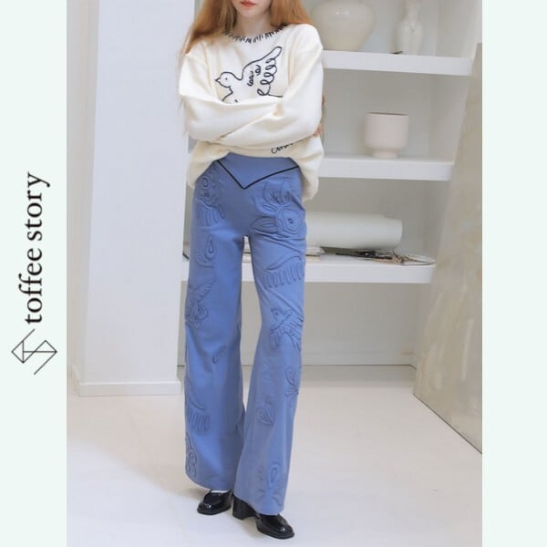 「Xunruo x Elizabeth」:鳥達が舞うエンボスワイドパンツ XU0095