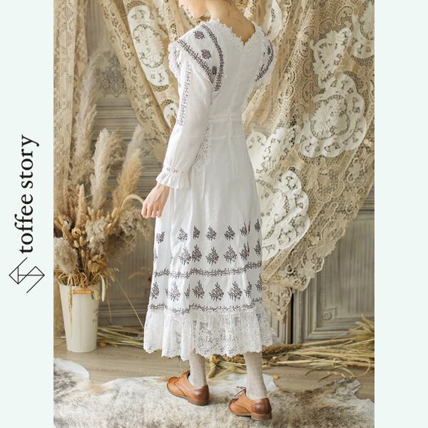 選び抜かれた素材と繊細な刺繍やレースが融合した、蚤の市で見つけて来たようなアンティークな雰囲気漂うワンピース。